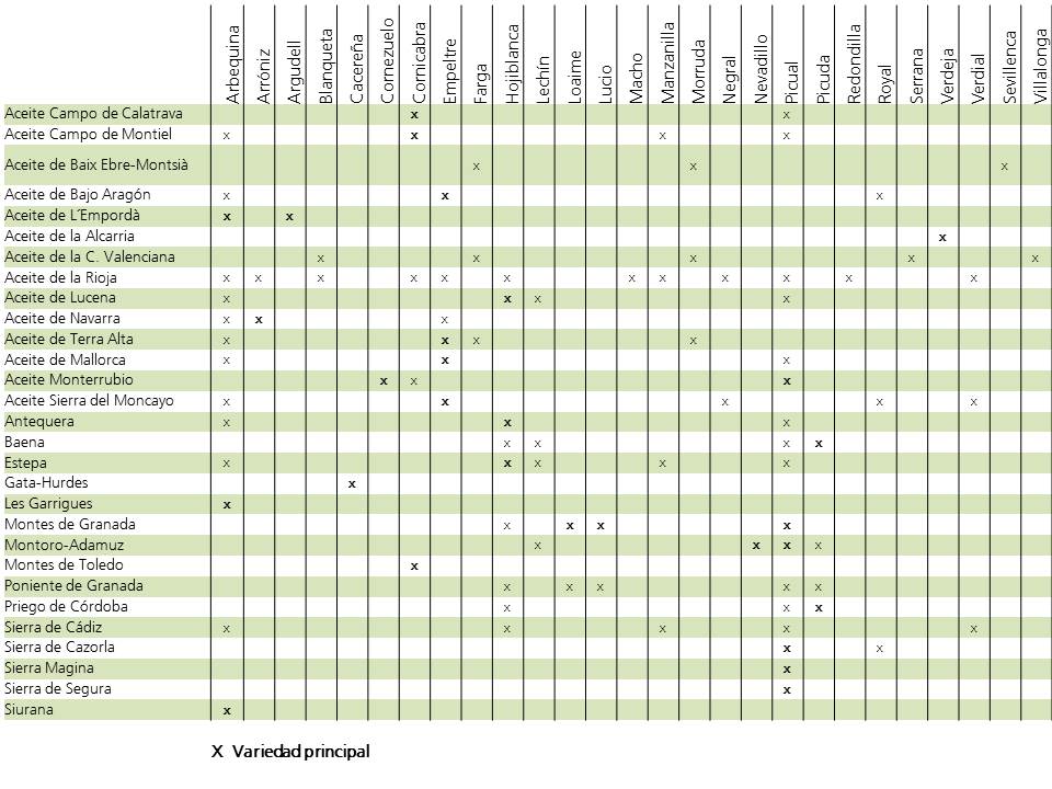 En el mapa varietal de las 29 Denominaciones de Origen Protegidas que hay reconocidas en España para el aceite de oliva, hay más de 30 variedades de olivo reconocidas como válidas. Hemos elaborado el siguiente cuadro para reflejar graficamente la realidad de nuestras D.O.P.